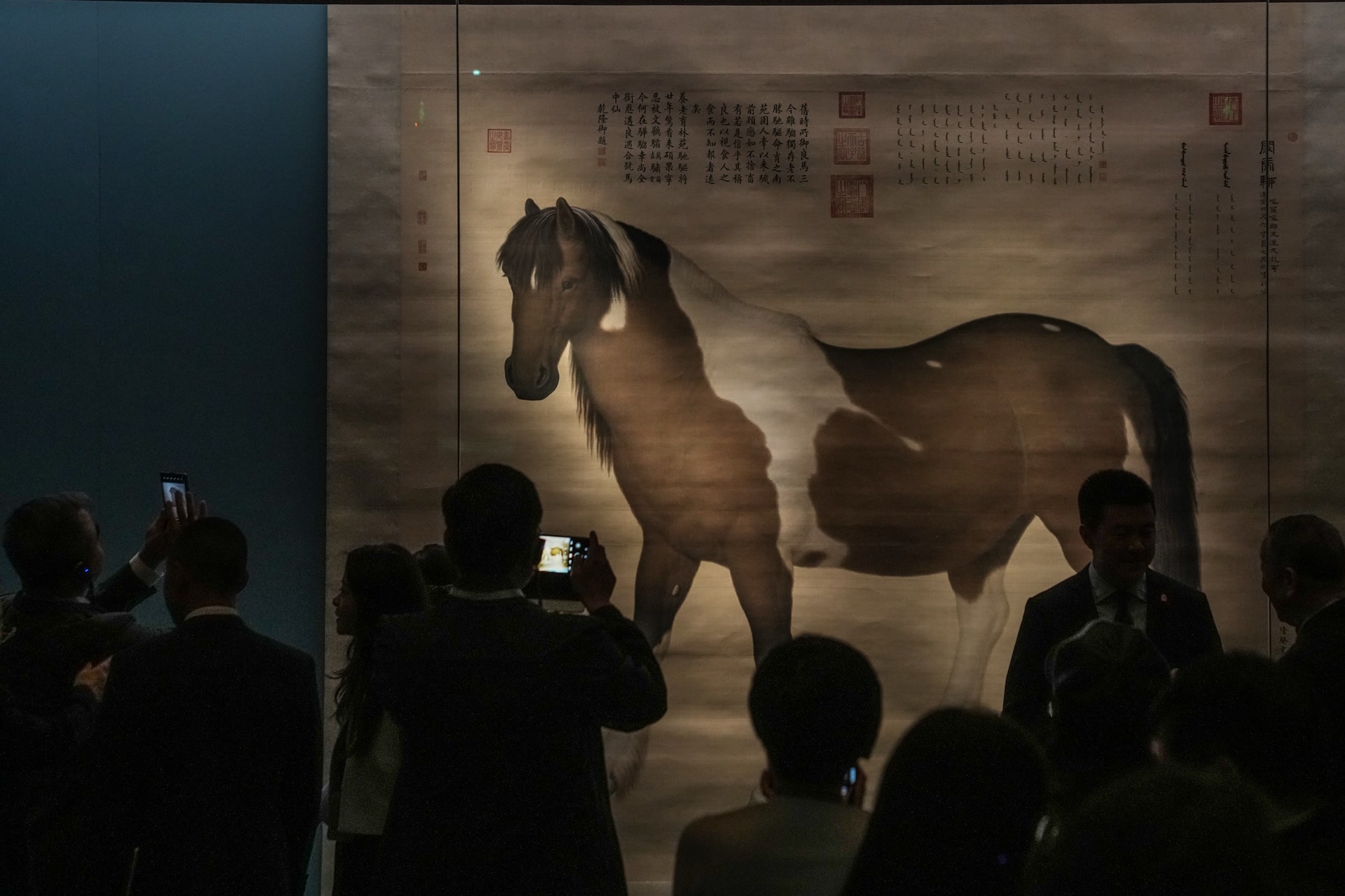 图为“神骏:故宫书画艺术中的马世界”展厅内,参观者驻足观展。包括这幅画在内,故宫重磅特展“神骏:故宫书画艺术中的马世界”展一口气展出了55件“神骏图”,其中20件是国宝级别,金代赵霖《昭陵六骏图》、元代任仁发《出圉图》、清代郎世宁《阚虎骝图》等历代画马名作悉数到场。还有传世唯一记录了“马厩养猴”习俗的《百马图》卷等28件未曾展出过的精彩作品首秀。