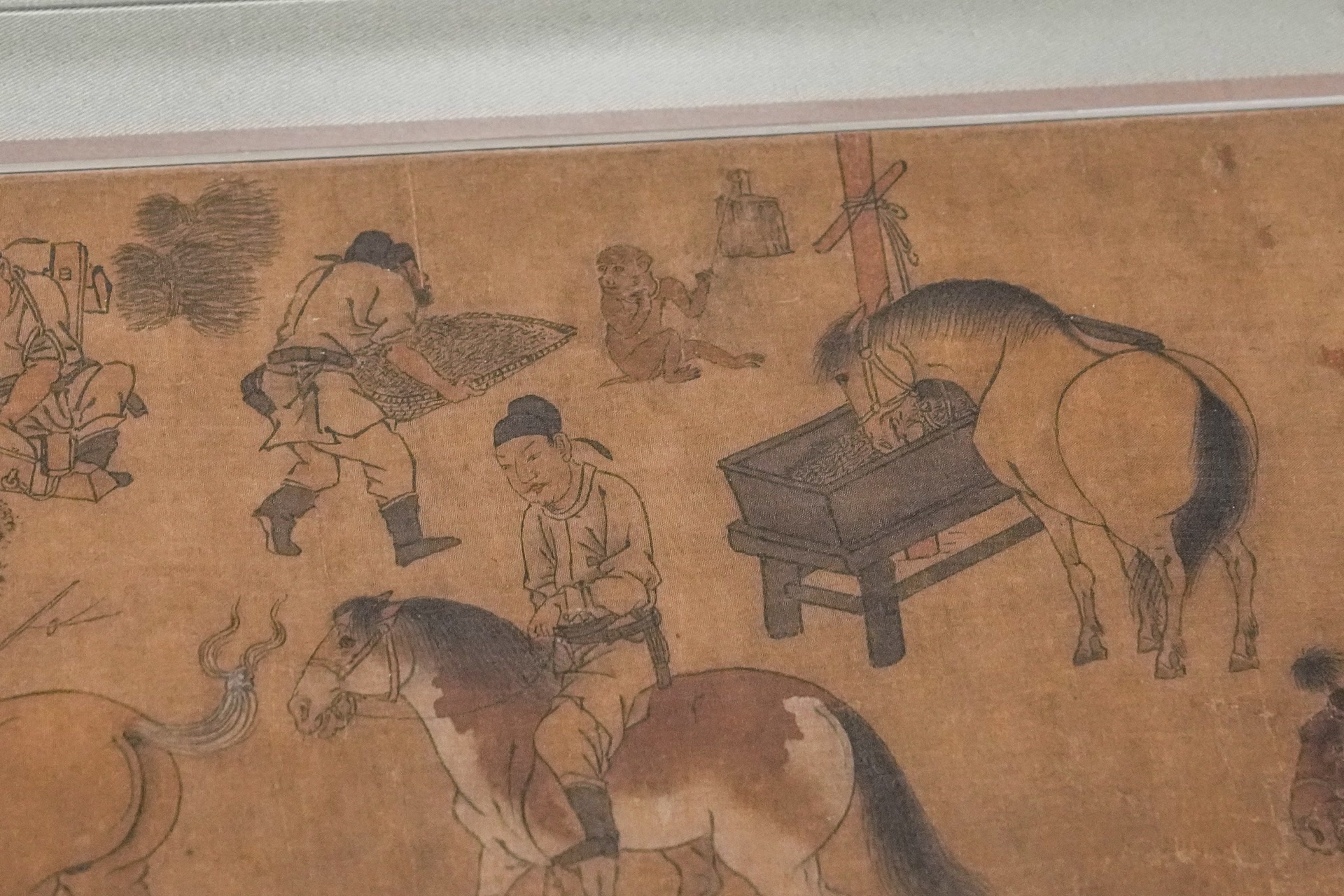 “神骏:故宫书画艺术中的马世界”展览展出的唐人(传)《百马图》卷局部饲喂、养猕猴避瘟的场景。二、宋 李公麟《摹韦偃〈牧放图〉》卷