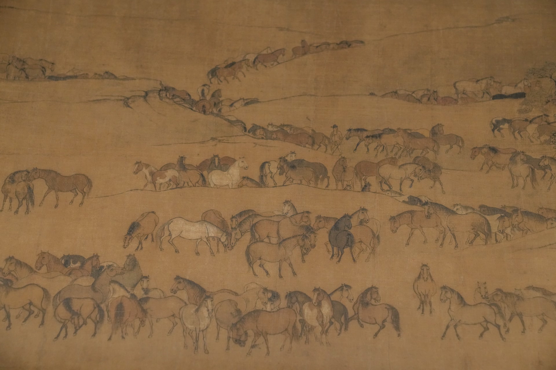 “神骏:故宫书画艺术中的马世界”展厅内,参观者在宋代李公麟《摹韦偃牧放图》卷前驻足。 “这是公认的李公麟真迹之一。我仔细数了数,画面上一共有1247匹马、142个人,可谓洋洋洒洒。”故宫书画部研究馆员马顺平说,宋代画家临摹唐人作品,绝非简单的复制粘贴,而是加入了自己的风格。比如,画马的线条柔中带刚,并非唐代崇尚的充满力量感。“人马虽多,但整个作品主次分明、生动活泼,不呆板,不混乱。如此庞大的构图,一定经过了长时间的经营和缜密的运思。”