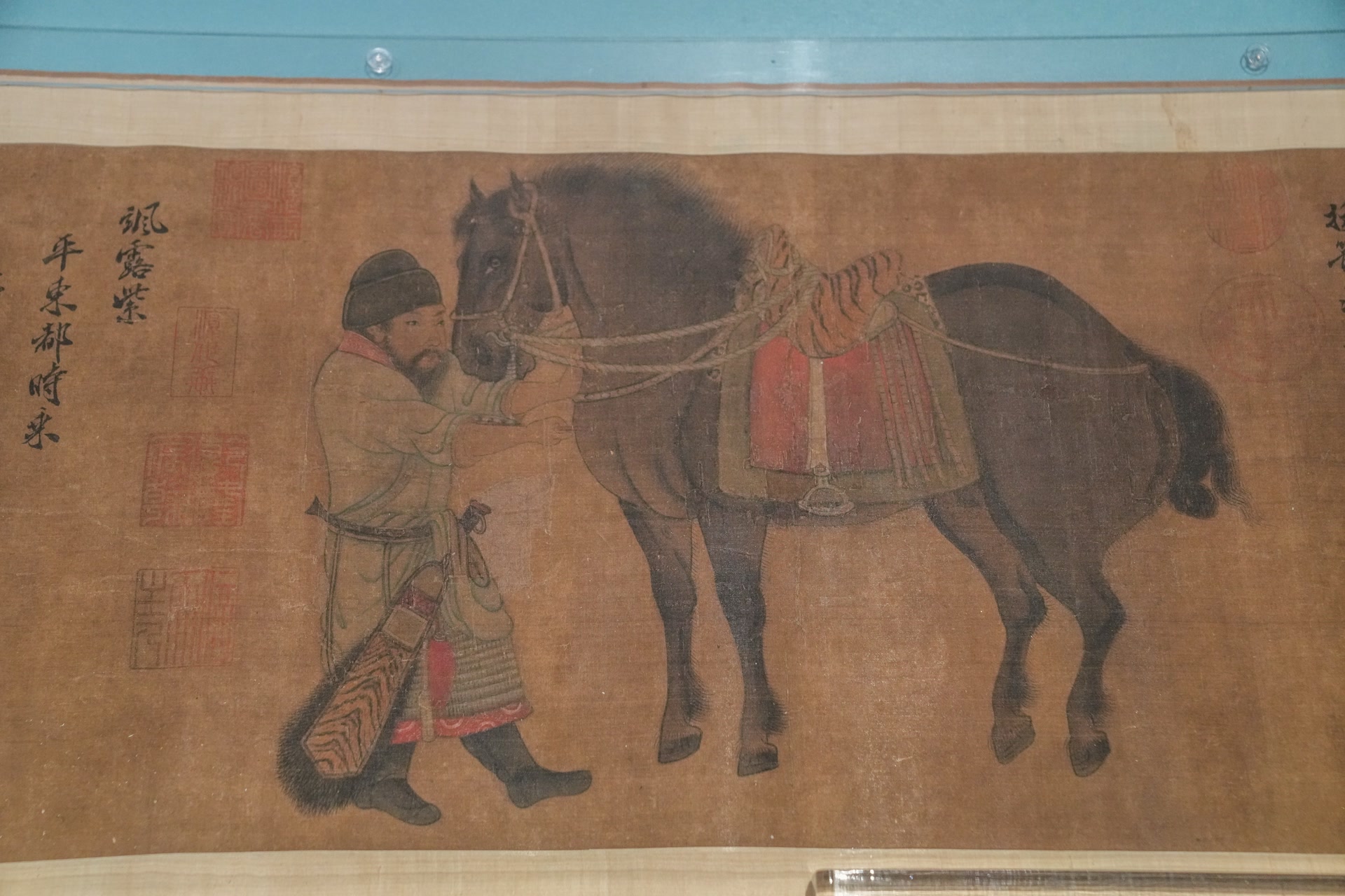 “神骏:故宫书画艺术中的马世界”展览展出的金代赵霖《昭陵六骏图》卷局部。四、元 赵孟頫《人骑图》卷