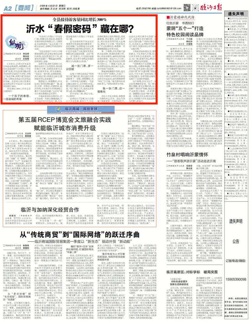 这个春假,沂水交出了一份让游客满意的答卷。免门票是假日策略,更是长期承诺,也是破解“门票经济”依赖、推动文旅产业转型升级的一次重要尝试。随着假日旅游不断升温,将进一步激活沂水全域文旅发展活力,持续提升沂水文旅品牌的知名度与影响力。