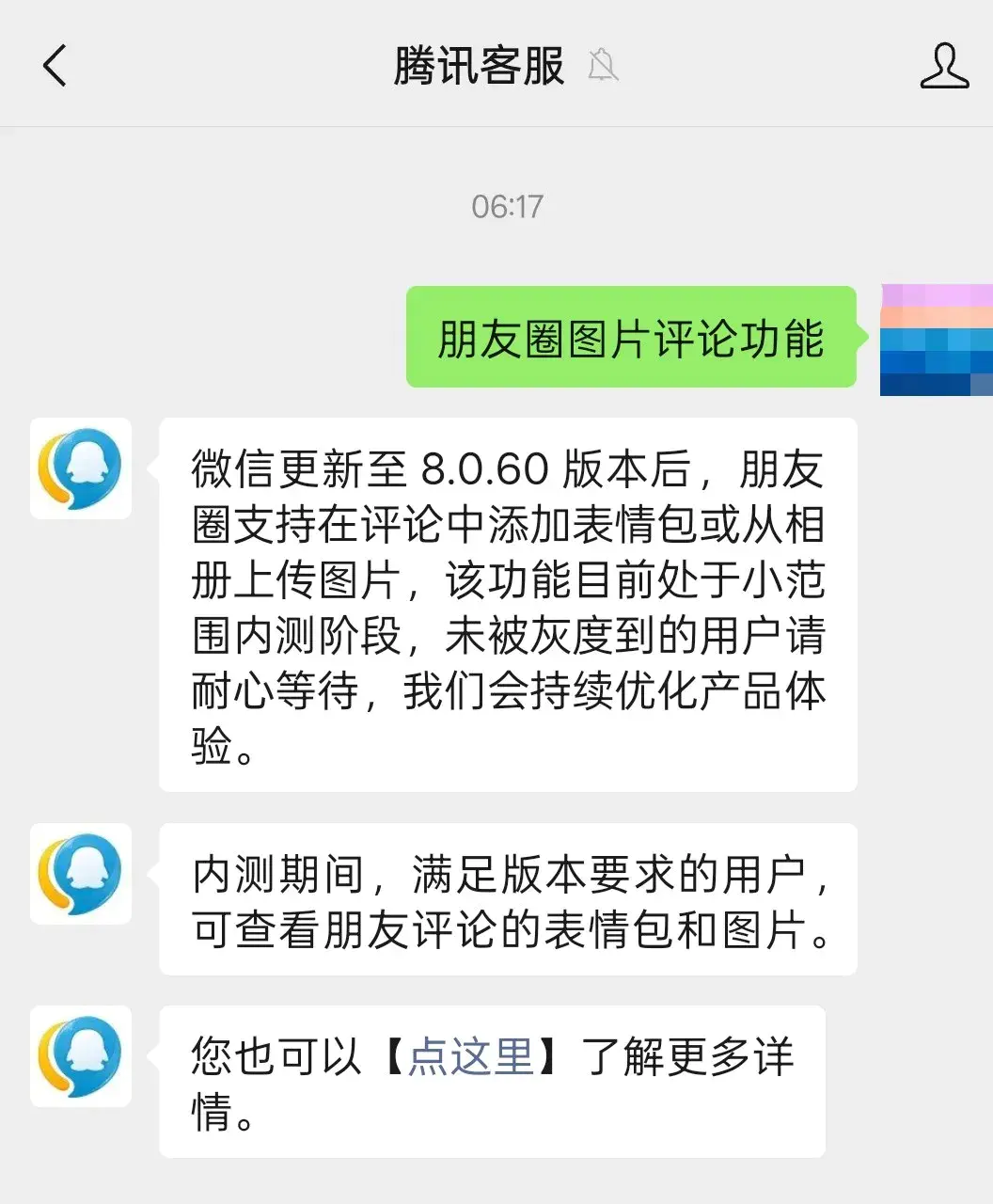 对此,腾讯客服回应称:“微信更新至8.0.60版本后,朋友圈支持在评论中添加表情包或从相册上传图片,该功能目前处于小范围内测阶段,未被灰度到的用户请耐心等待,我们会持续优化产品体验。内测期间,满足版本要求的用户,可查看朋友评论的表情包和图片。”