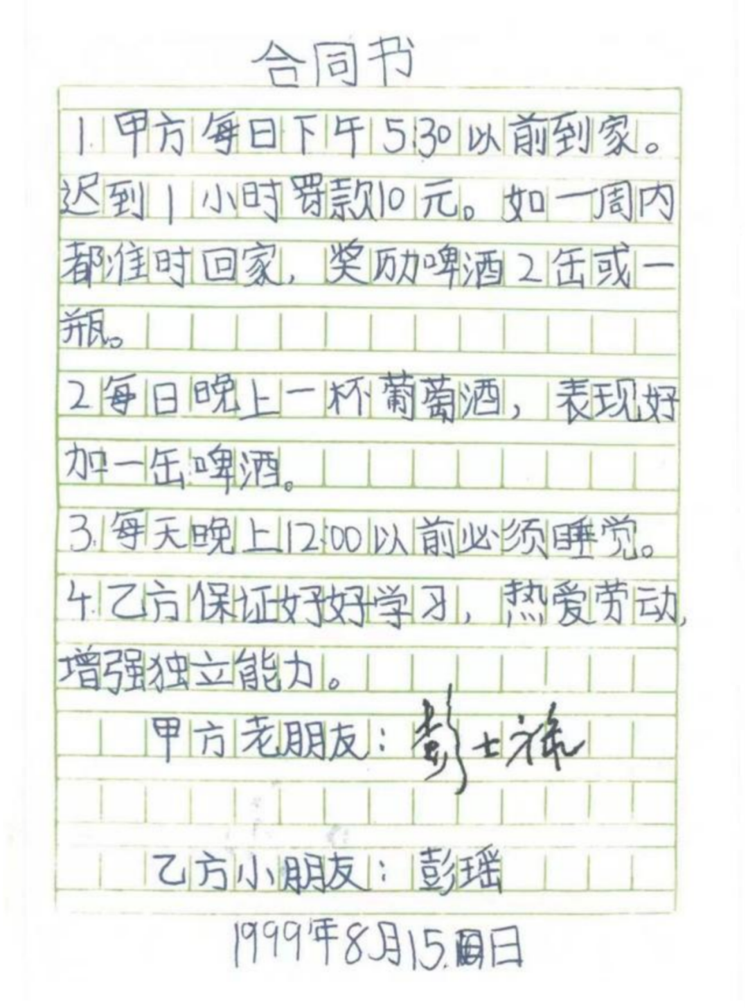 这份特殊的“合同书”,甲方是“老朋友:彭士禄”,乙方是“小朋友:彭瑶”。