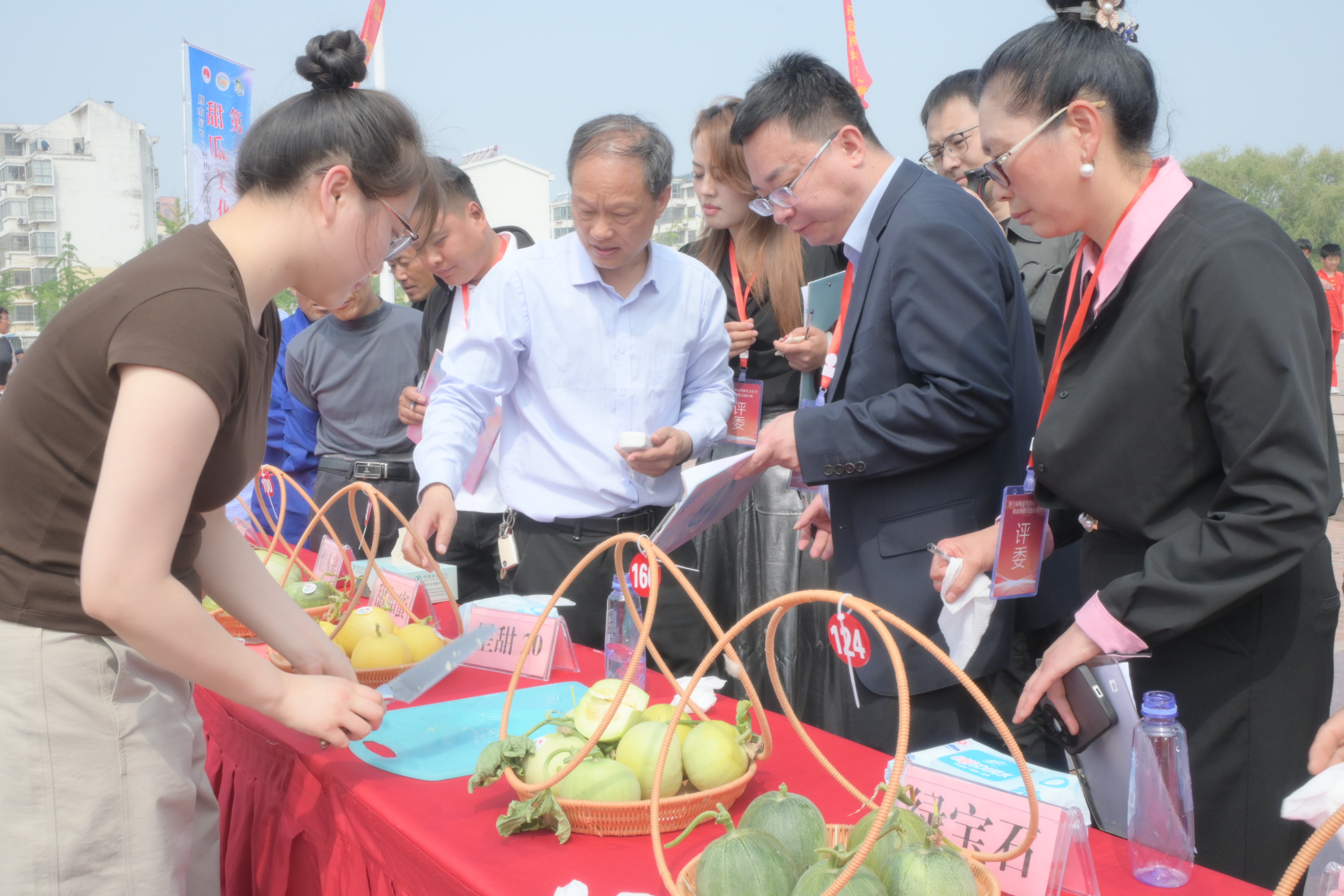 瓜农们则围在一旁,眼神紧紧盯着专家们的动作,时不时低声交流着自家甜瓜的种植心得。“我家这甜瓜,用的是有机肥,浇水都是定时定量,就盼着能拿个好成绩。”来自盛安村的武可堂一边搓着手,一边笑着说道,脸上满是对自家果实的自信。种植甜瓜多年的宋振娟则略显紧张:“今年天气好,甜瓜长得比往年好,但参赛的高手太多,能评上奖就很满足了,主要是想听听专家的指导,以后把甜瓜种得更好。”