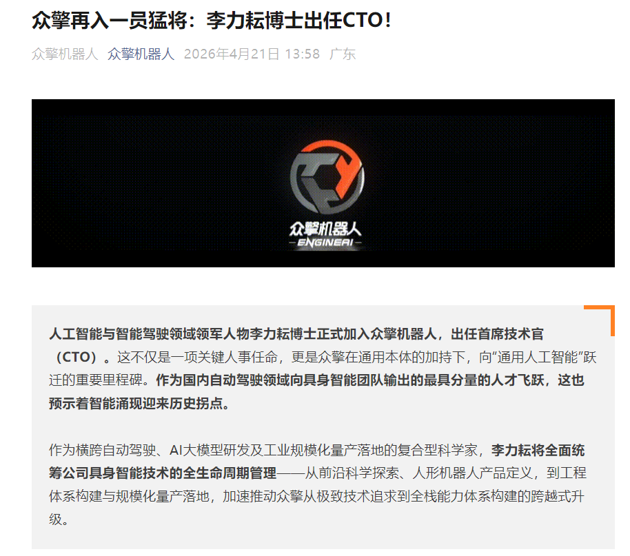 4月21日,众擎机器人宣布李力耘正式加入公司,出任首席技术官(CTO)。
