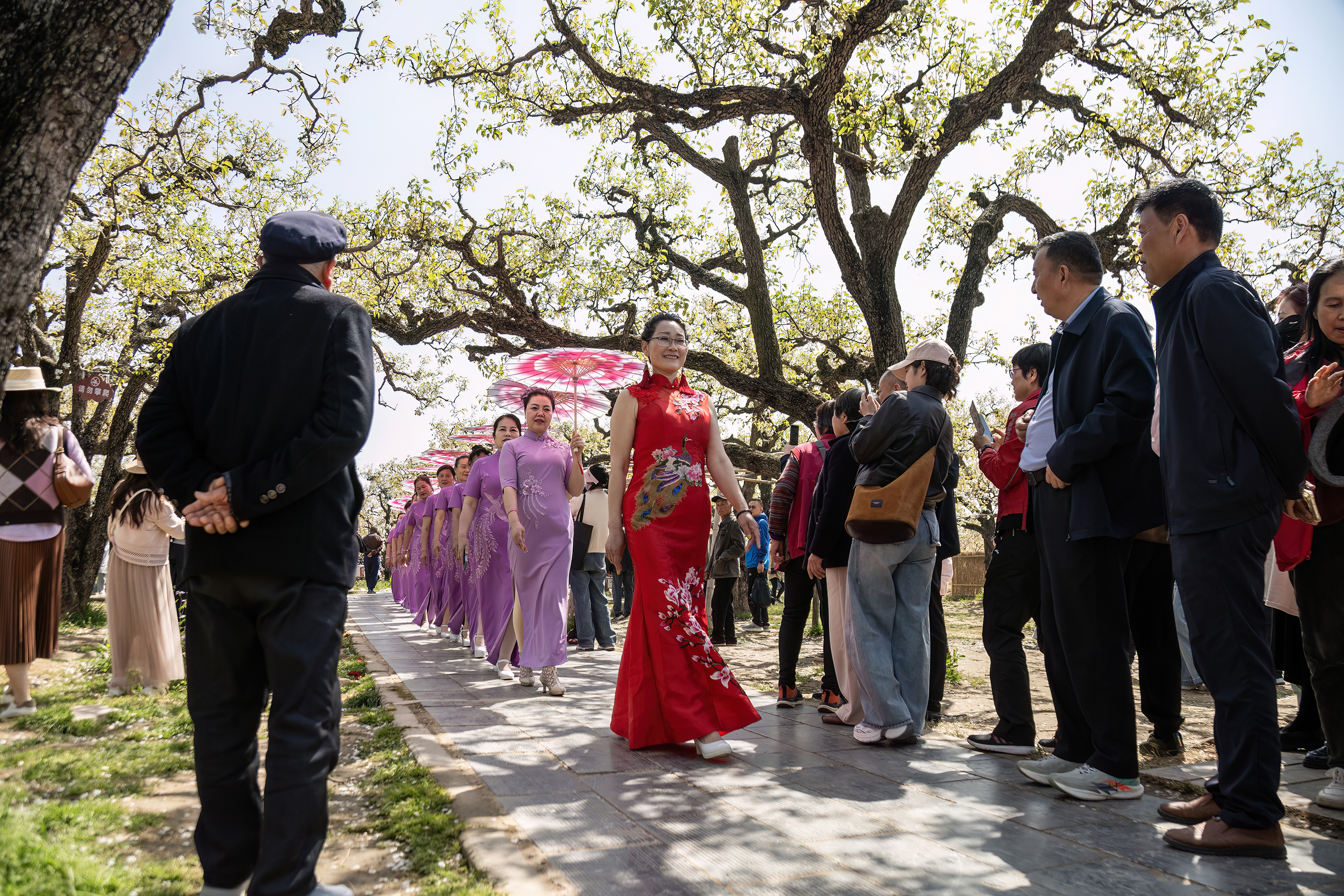 作品介绍:本组作品拍摄于2026年4月4日枣庄市滕州刘村梨园。老年旗袍队阔步走在梨园小路上,定格下运动健身、传统服饰与春日风光交融的生活之美。
