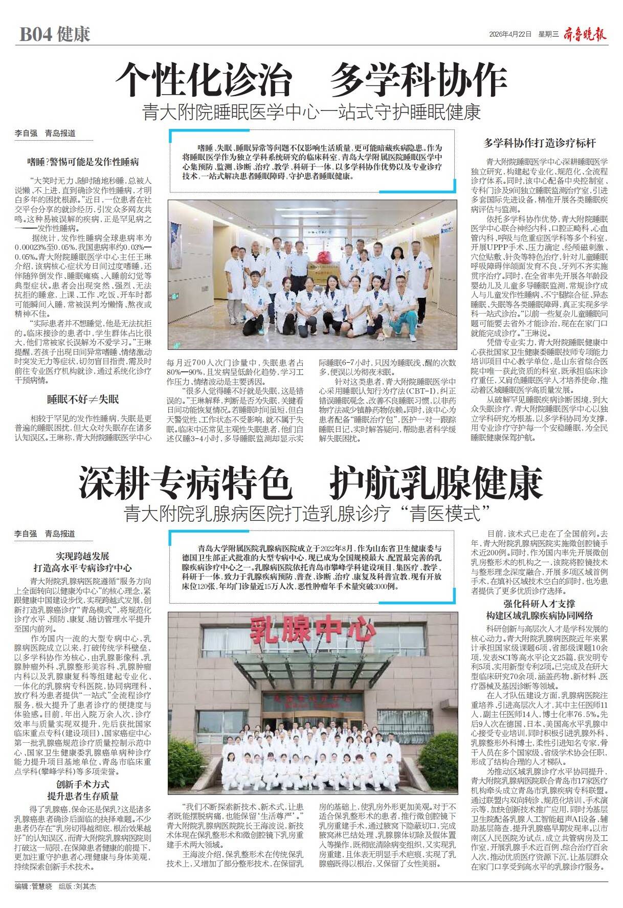 从破解罕见睡眠疾病诊断困境,到大众失眠诊疗,青大附院睡眠医学中心以独立学科研究为根基,以多学科协同为支撑,用专业诊疗守护每一个安稳睡眠,为全民睡眠健康保驾护航。
