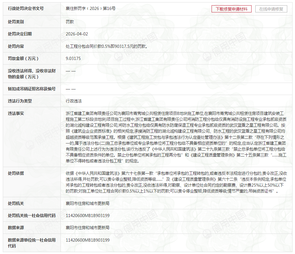 日前,信用中国公示了浙江省建工集团有限责任公司的行政处罚决定。行政处罚决定书文号襄住新罚字﹝2026﹞第16号显示,浙江省建工集团有限责任公司为襄阳市青隽城公共租赁住房项目B地块施工单位,在襄阳市青隽城公共租赁住房项目建筑安装工程施工第二标段(B地块)项目施工过程中,浙江省建工集团有限责任公司将消防工程分包给仅具有消防设施工程专业承包贰级资质的湖北诚构建设工程有限公司,将防水工程分包给仅具有防水防腐保温工程专业承包贰级资质的武汉蓝盾之星工程有限公司。按照《建筑业企业资质标准》的相关规定,承接消防工程的湖北诚构建设工程有限公司、防水工程的武汉蓝盾之星工程有限公司均超越资质等级范围承接工程。