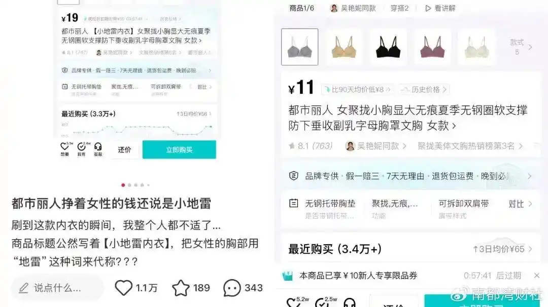 近日,有网友投诉,都市丽人在得物APP上架的一款内衣,标注“小地雷内衣”字样。该表述被指物化女性、带有侮辱意味,引发消费者强烈不适。
