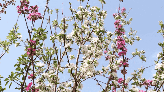 四月清风拂过,在位于东营区六户镇的果园内,一棵苹果树吸引了所有人的目光——粉白与嫣红的花朵在同一棵树上同时绽放,交相辉映,宛如一幅绚丽的春日画卷。不少游客驻足拍照,纷纷发问:“这是什么神仙品种?一棵树还能开出不同颜色的花?”