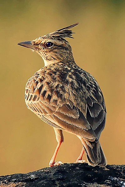 上面两种百灵,常常分不大清。在我看来,最好辨认的是“大雅兰儿”。除了体型大之外,最特别的就是它的冠羽——一大撮羽毛蓬立在头顶上,像留了一个桀骜不驯的发型。它的学名叫作凤头百灵。