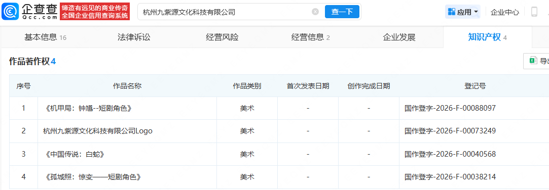 企查查显示,杭州九紫源文化科技有限公司成立于2025年4月,法定代表人为丁宽宽。知识产权信息显示,2026年2月,该公司曾登记《孤城照:惊变——短剧角色》作品著作权,作品类别为美术作品。公开信息显示,九紫源AI曾出品包括《孤城照:惊变》在内的多部AI短剧。