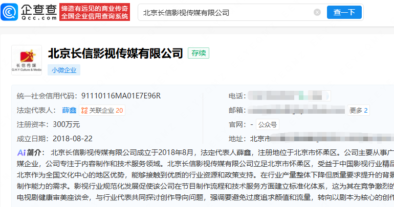 企查查APP显示,长信传媒关联公司北京长信影视传媒有限公司成立于2018年8月,法定代表人薛鑫,由天津长信影视传媒有限公司全资持股,郭靖宇为实际控制人。值得一提的是,该公司与爱奇艺旗下爱奇艺创想无限(上海)科技有限公司已成立爱奇艺快乐无限(北京)文化传媒有限公司。