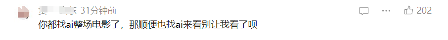 有网友评论:你都找ai整场电影了,那顺便也找ai来看别让我看了呗。