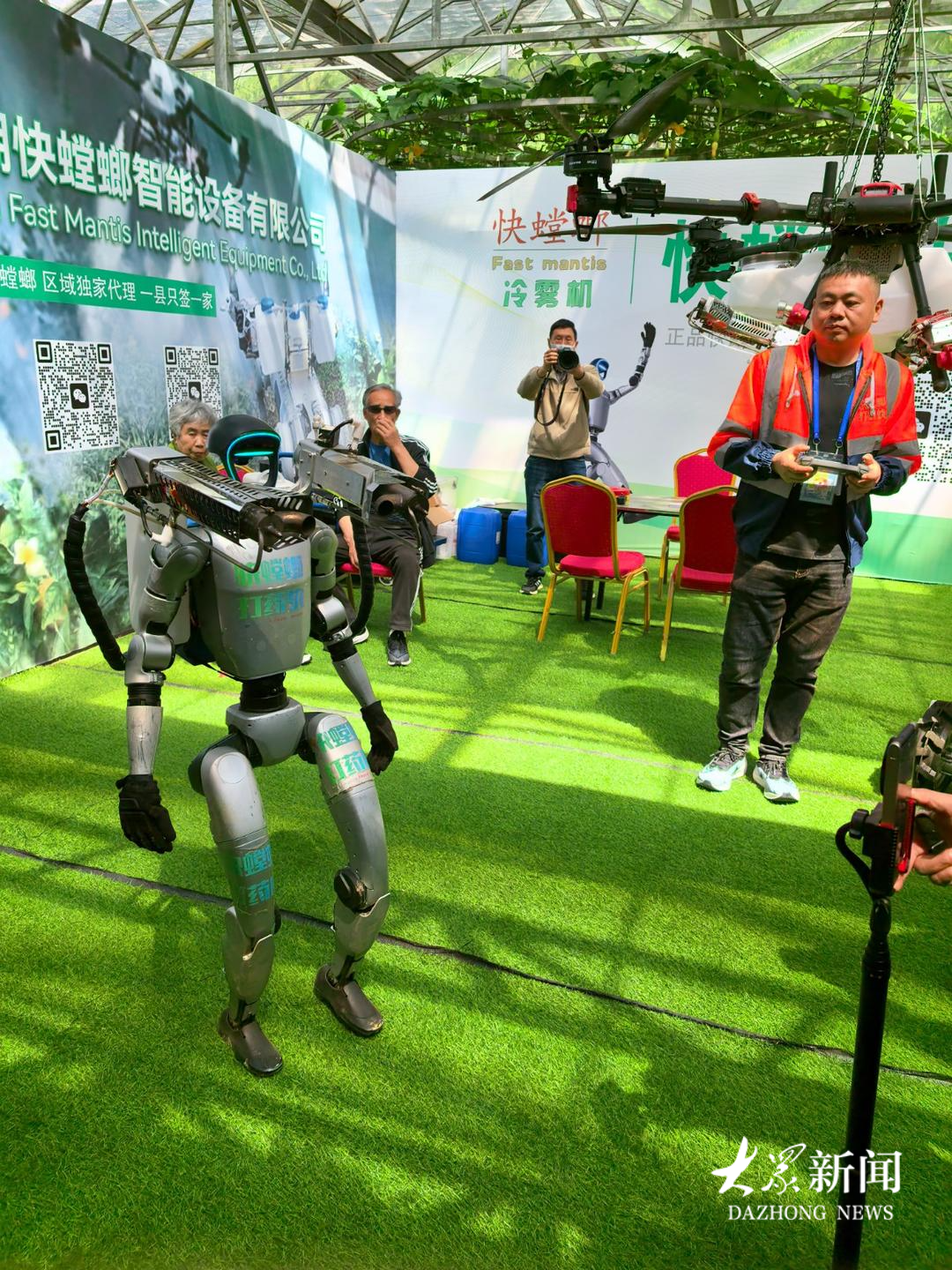可以行走的喷药人形机器人亮相菜博会。