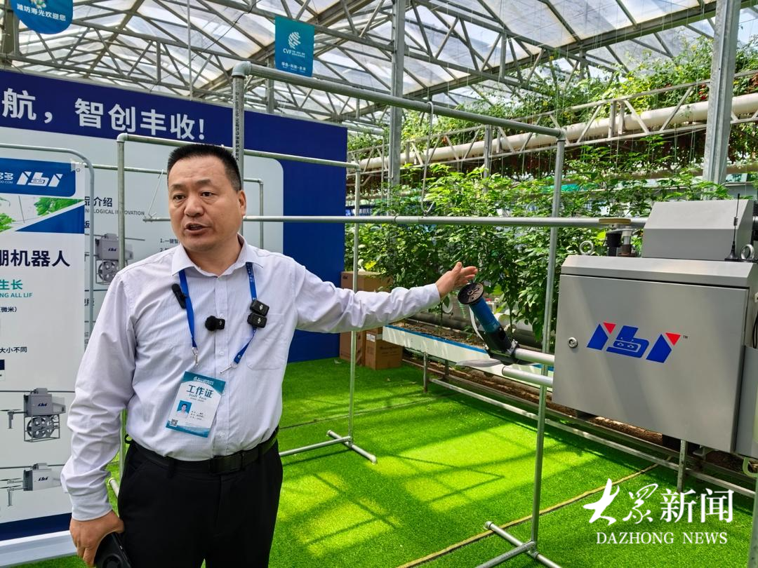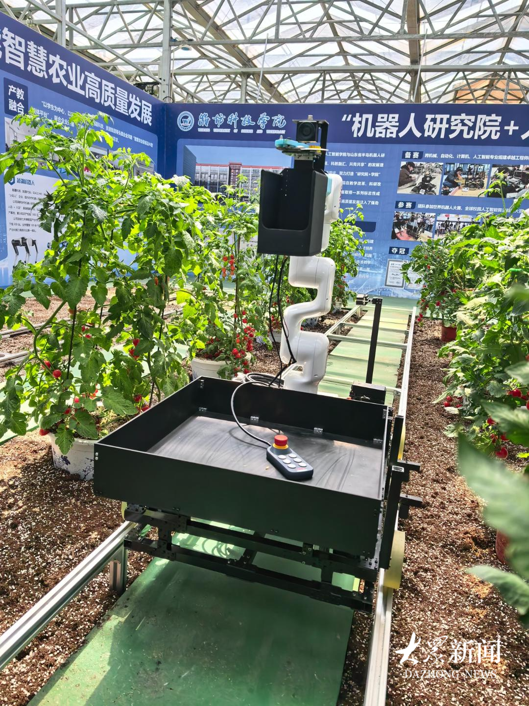 坐落在寿光市的潍坊科技学院,积极服务地方经济社会发展,大力发展智慧蔬菜等学科。在10号展馆,该校的人工智能学院带来了栽培机器人、番茄采摘机器人等智慧化设备。