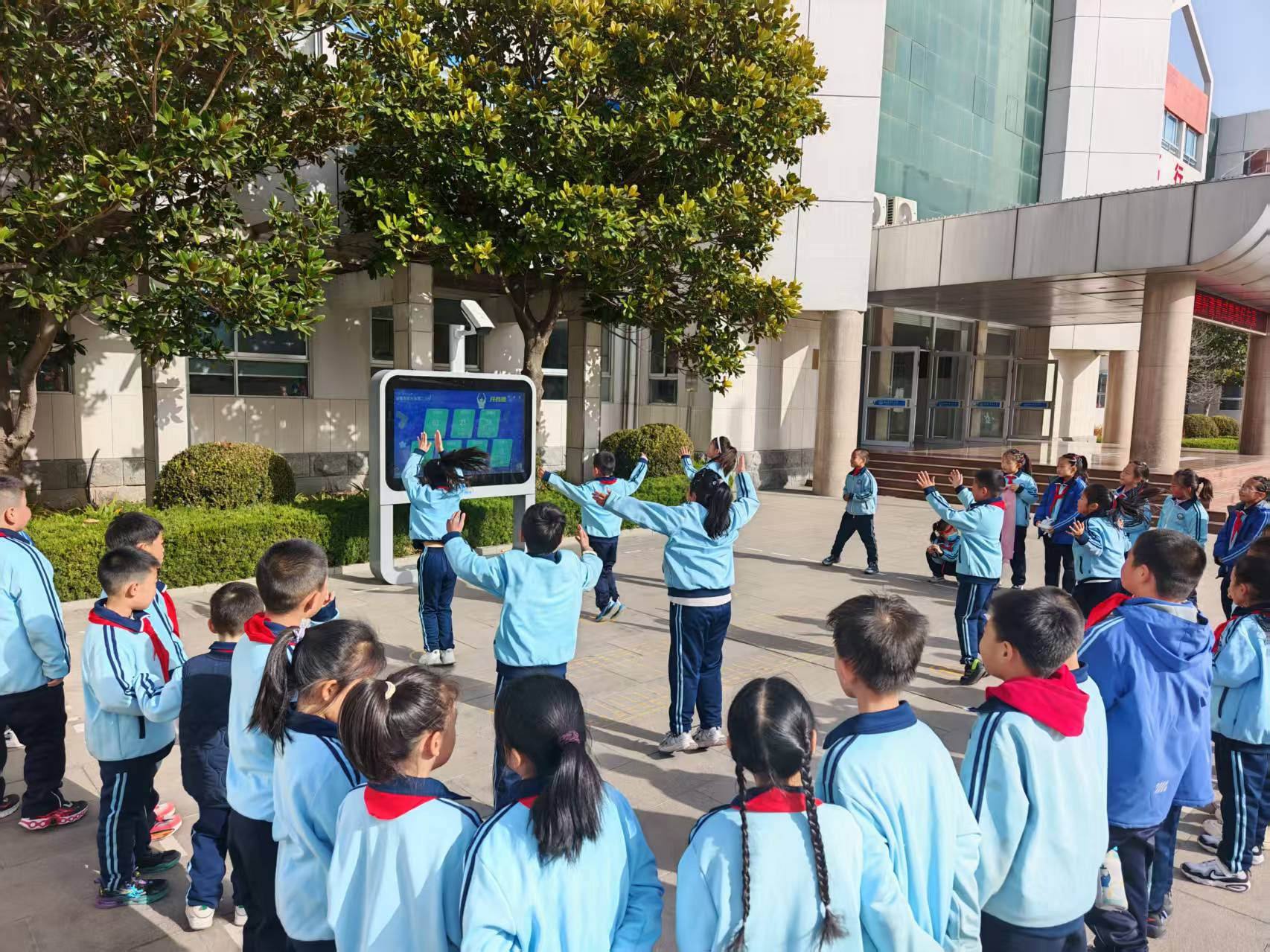 最热闹的还要数前院的两处AI智慧体测屏,早上一进校门,便能看到孩子们在体测机前运动的身影,大课间时这里更是围满了人,高抬腿、跳远、深蹲,每一项运动都能获得科学有效的指导。孩子们盯着屏幕上的数据,看着自己的排名逐步上升,运动的劲头更足了。