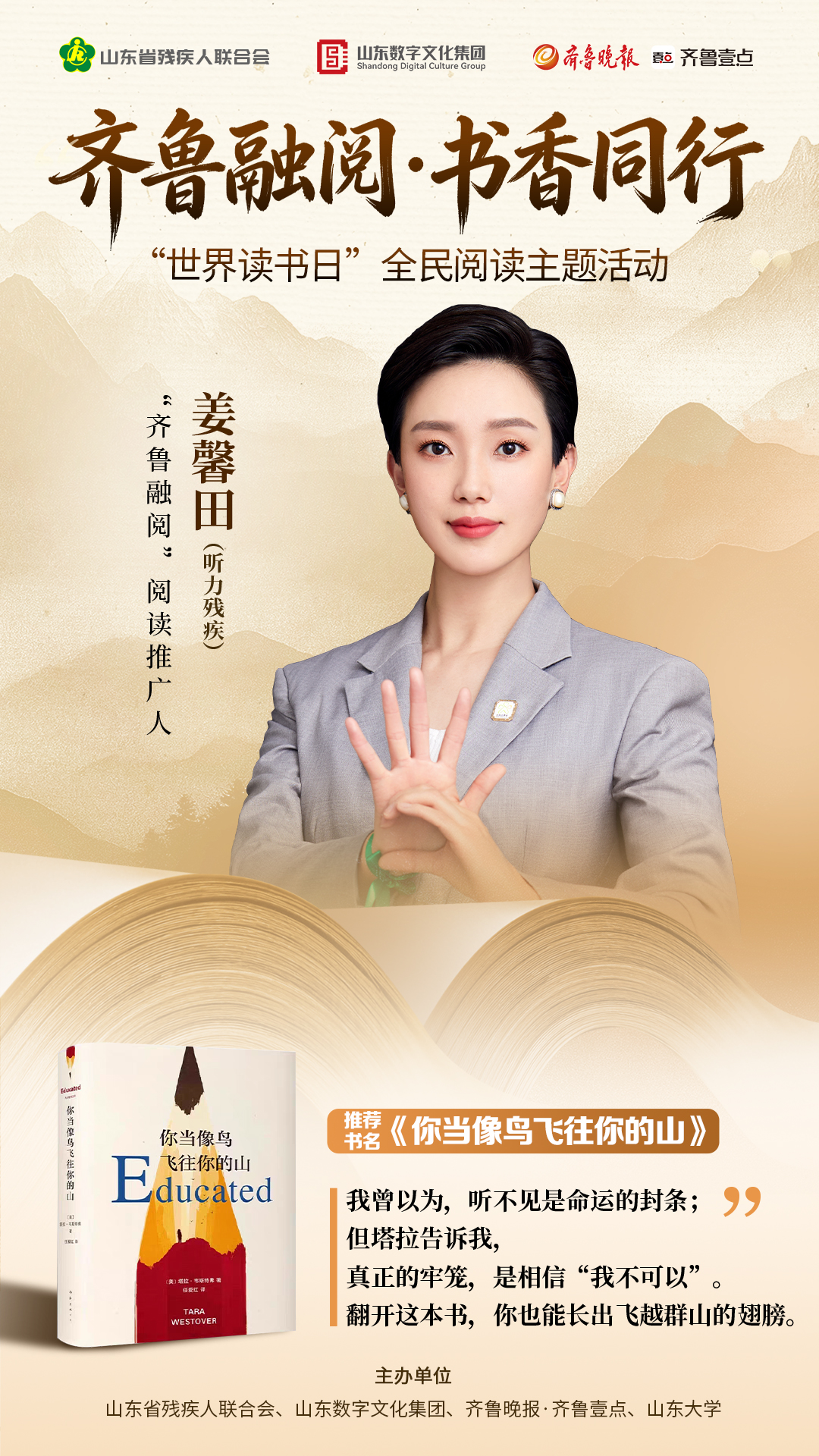 个人简介:姜馨田,自幼生活在无声世界,却从未停止用眼睛“聆听”文字。通过阅读,她找到与世界对话的方式;通过分享,她希望帮助更多残障朋友从书中获得光亮。在她看来,手语是她的语言,书是她的声音。