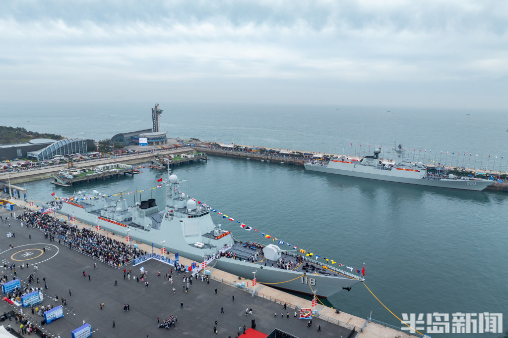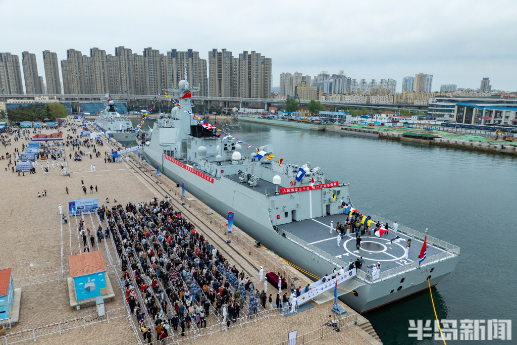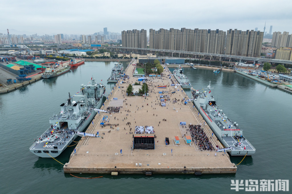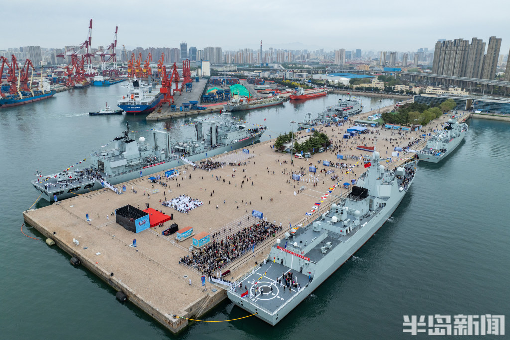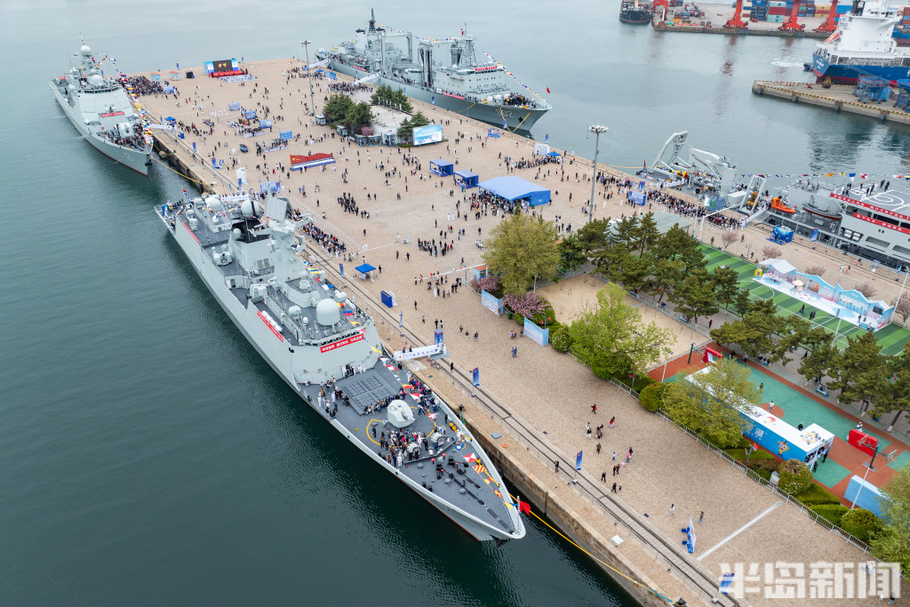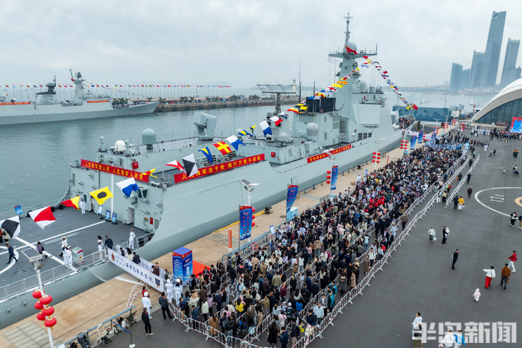 4月22日,青岛奥帆中心码头与青岛港三号码头,人民海军成立77周年北部战区海军舰艇开放活动举行,吸引大批群众前来一睹战舰风采。