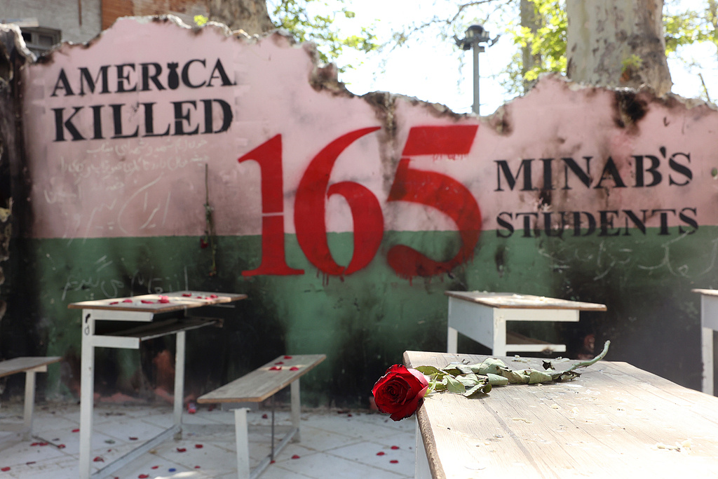 △伊朗德黑兰北部,一朵花被放置在象征米纳卜学校的纪念处(资料图)当地时间22日,伊朗教育部长卡泽米表示,在本轮美以伊冲突中,伊朗共有约1300所学校受损,其中20所学校被完全摧毁。