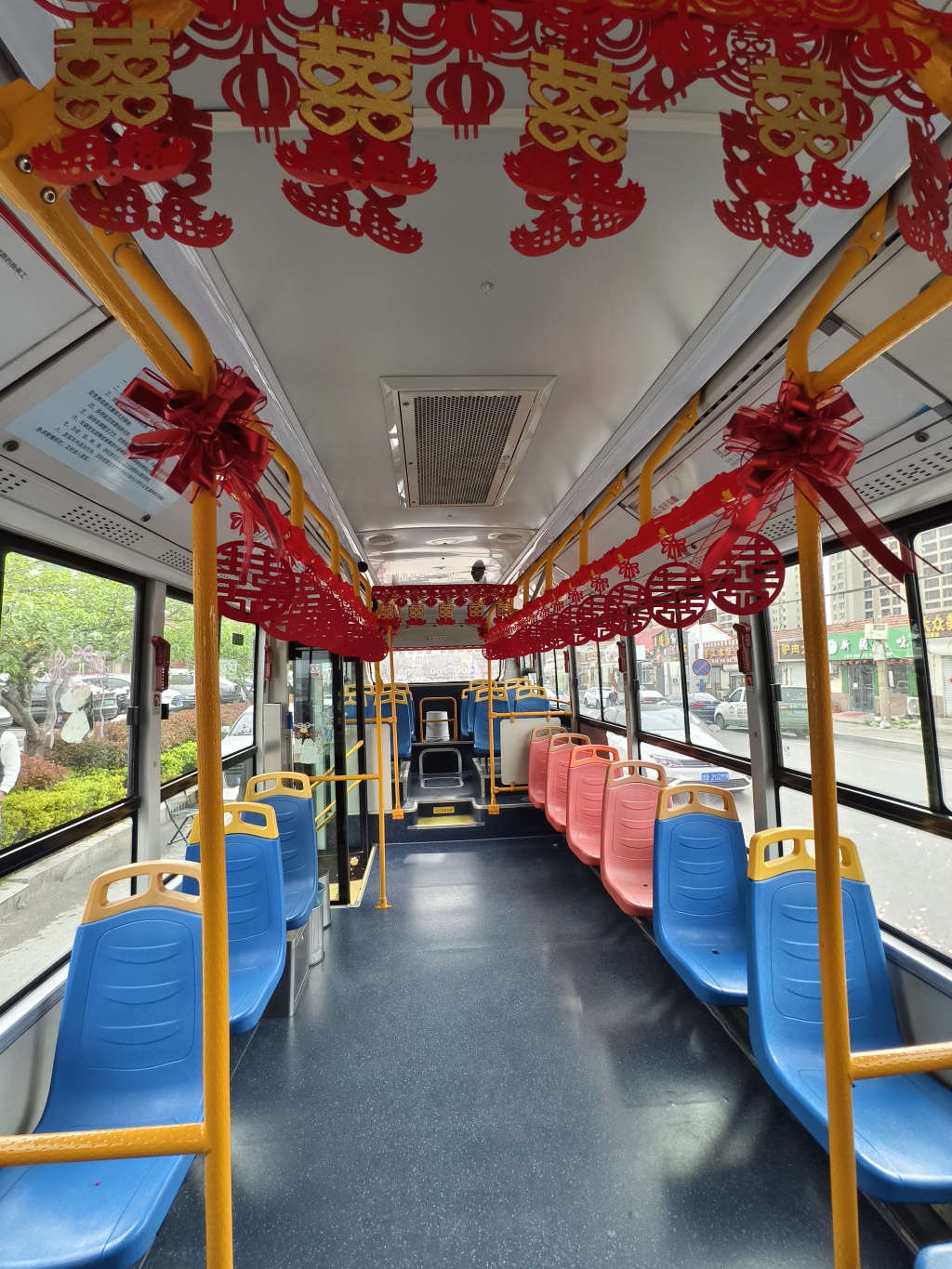 当天上午,一辆精心装扮的公交车亮相胶州街头,大红喜字醒目地点缀在车头,车厢内红灯笼、彩带与各类喜庆挂饰交相辉映,浓浓的仪式感扑面而来,空气中都弥漫着幸福的甜味。