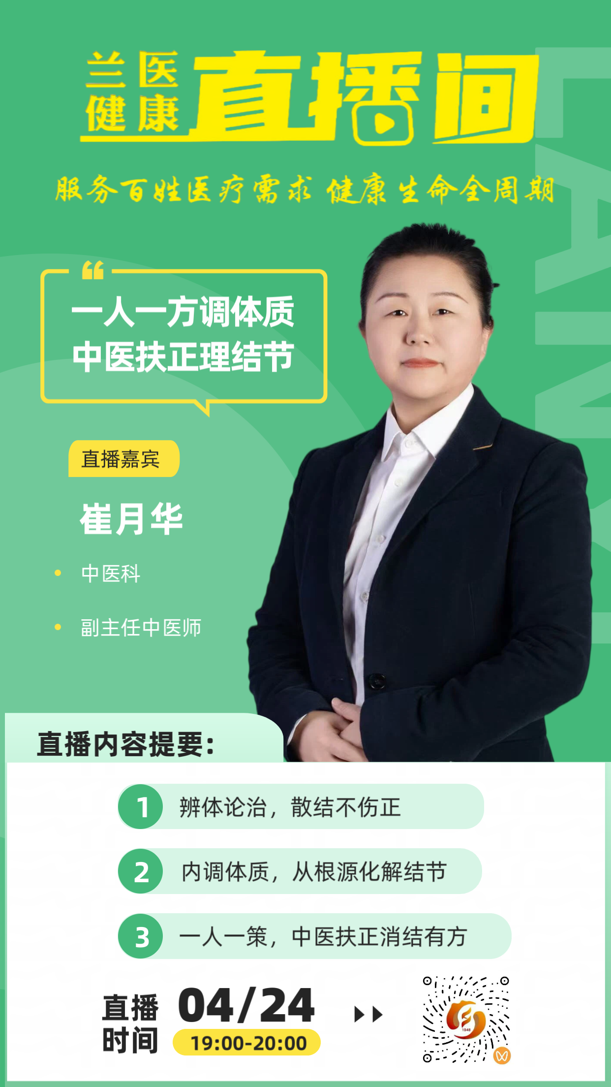 4月24日19点,兰医健康直播间将邀请副主任中医师崔月华,带来“一人一方调体质,中医扶正理结节”的分享。