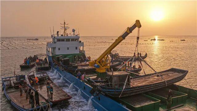 在现场,养殖工人正在将一个个黑色的鲍鱼笼,从大船转运到小船上,将这些“候鸟鲍”及时投放到养殖海域,开启新一轮生长。