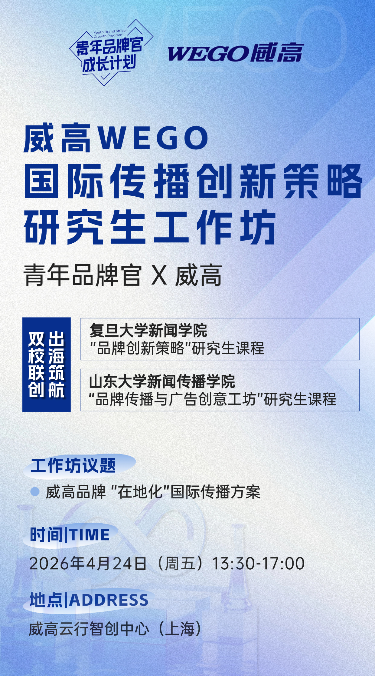 来自复旦大学与山东大学的“青年品牌官”,在威高云行智创中心连线,会碰撞出怎样的火花?4月24日,由复旦大学新闻学院汤筠冰教授与山东大学新闻传播学院臧丽娜教授联合策划的“双校联创出海筑航——威高WEGO国际传播创新策略研究生工作坊”,将在威高云行智创中心正式举行。