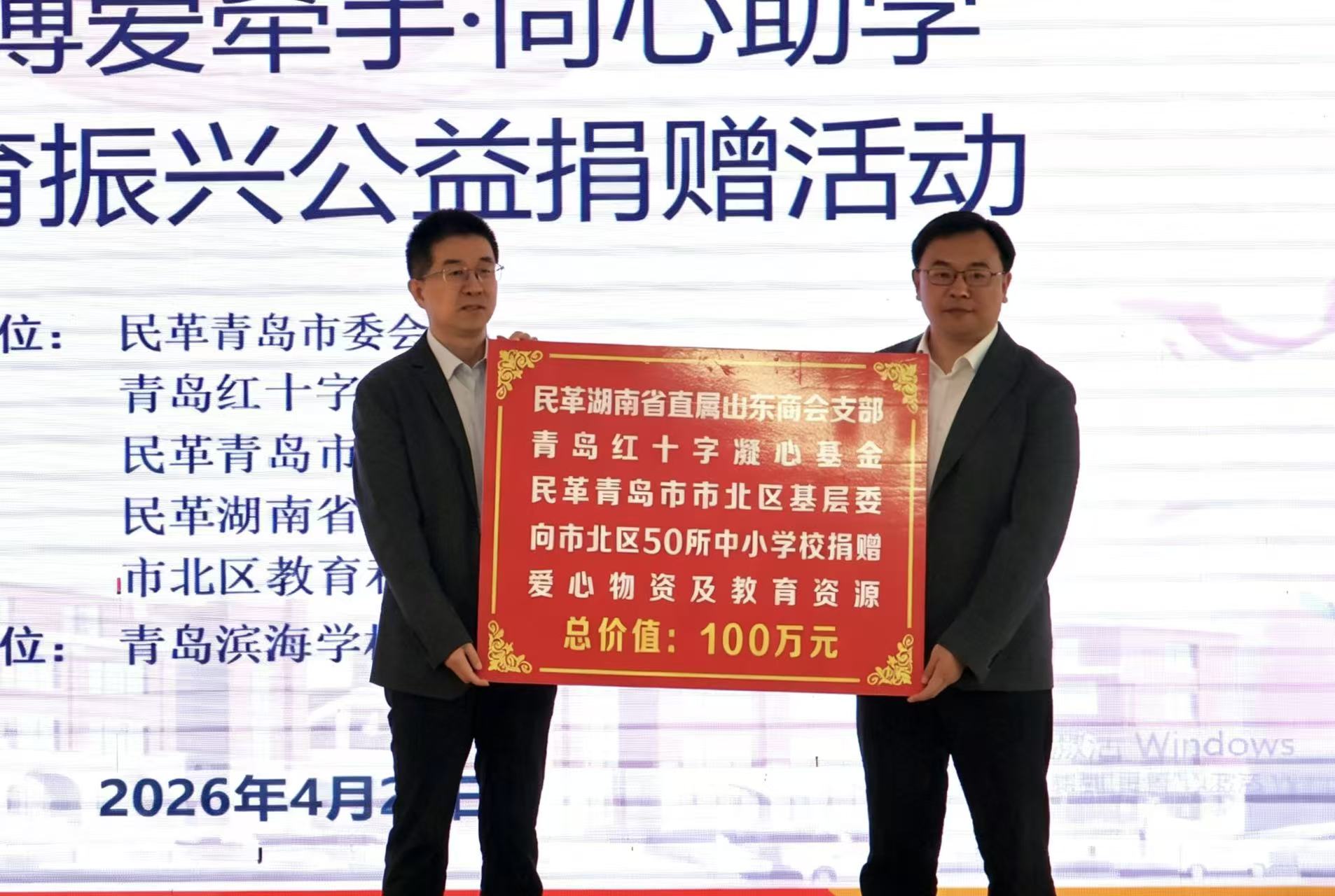 活动现场,民革湖南省直属山东商会支部向市北区教育领域捐赠价值100万元的体育器材及教学物资,用实际行动为辖区学子送上暖心关怀。