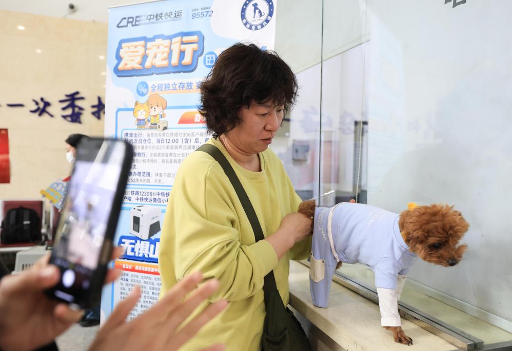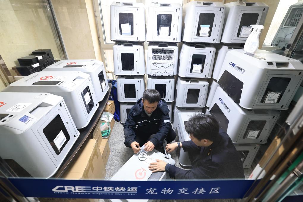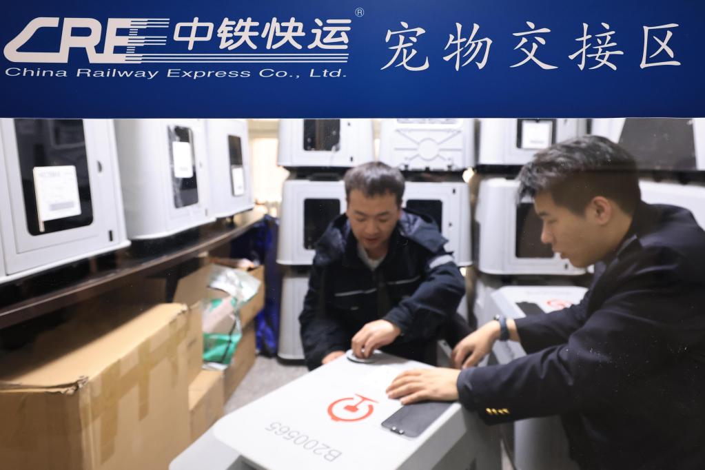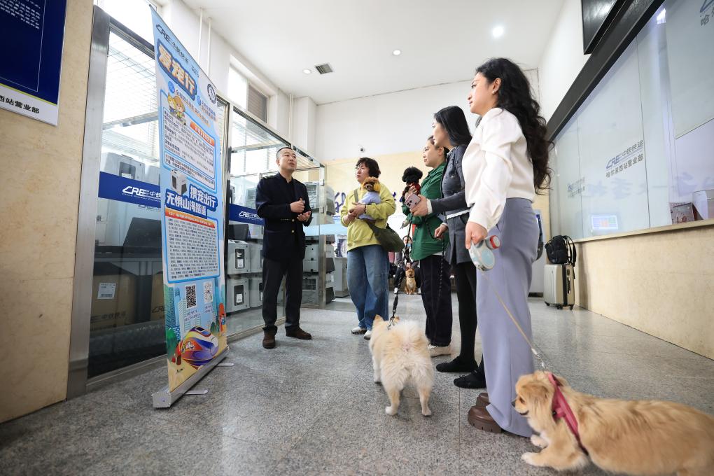 19日、乗客にペット輸送サービスの注意事項を説明する中鉄快運ハルビン西駅営業所の職員(左端)。(ハルビン=新華社配信/徐率)
