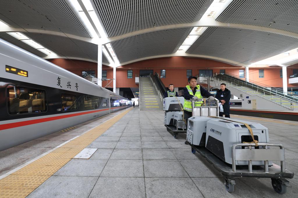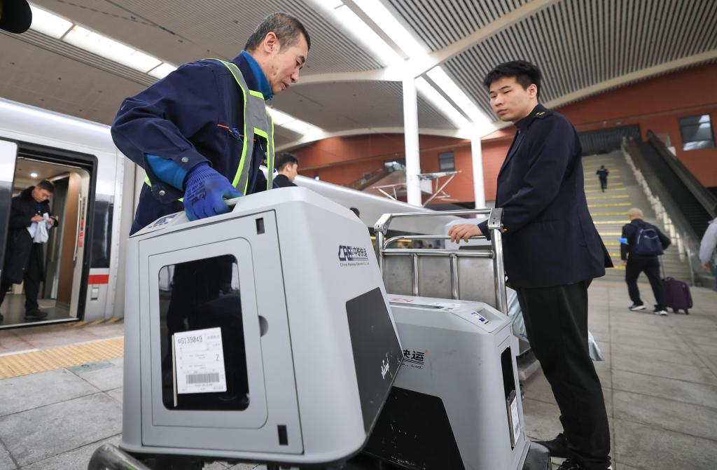 19日、ハルビン西駅で「スマートキャビン」を北京行きの列車に運ぶ中鉄快運ハルビン西駅営業所の職員。(ハルビン=新華社配信/徐率)