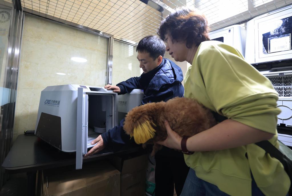19日、中鉄快運ハルビン西駅営業所で、ペットの犬を「スマートキャビン」に入れる乗客(右)と職員。(ハルビン=新華社配信/徐率)