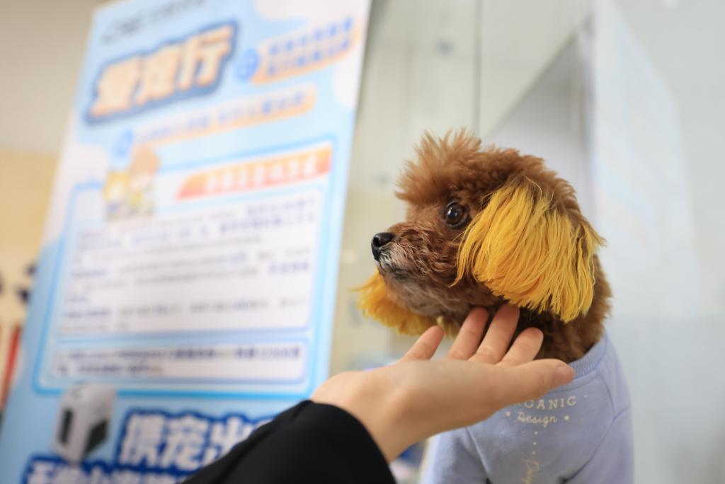 19日、中鉄快運ハルビン西駅営業所で「スマートキャビン」に入るペットの犬に触れる乗客。(ハルビン=新華社配信/徐率)