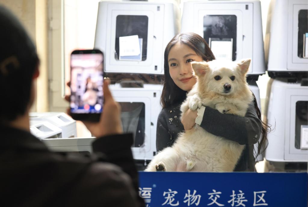 19日、中鉄快運ハルビン西駅営業所で「スマートキャビン」に入るペットの犬と記念撮影する乗客。(ハルビン=新華社配信/徐率)