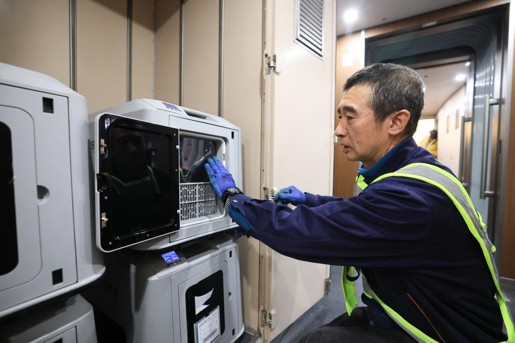 19日、北京行きの列車内で「スマートキャビン」を点検する中鉄快運ハルビン西駅営業所の職員。(ハルビン=新華社配信/徐率)