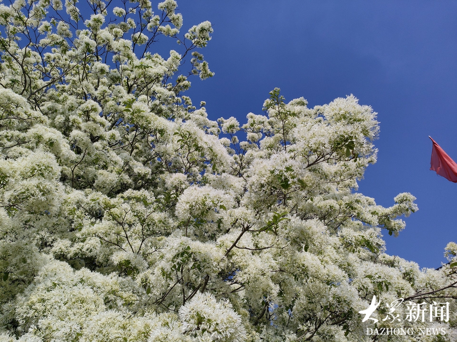 四月的敬仲镇春色正浓,走进辛路村村委大院,映入眼帘的是一棵高大茂盛的流苏古树,洁白的花开满整个树冠,纤长的花瓣绵绵密密,层层叠叠。微风吹来,香气四溢,满树银花随风摇曳,犹如“雪浪”翻飞,在春日暖阳的照耀下更显晶莹剔透,为村庄平添了几分雅致,吸引了众多慕名而来的市民和摄影爱好者。