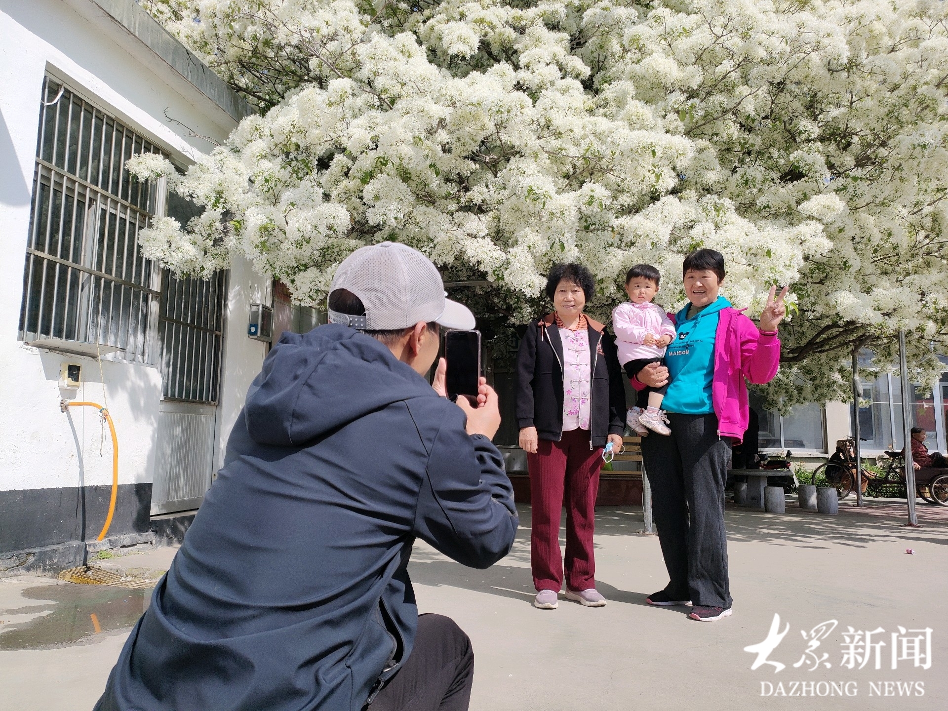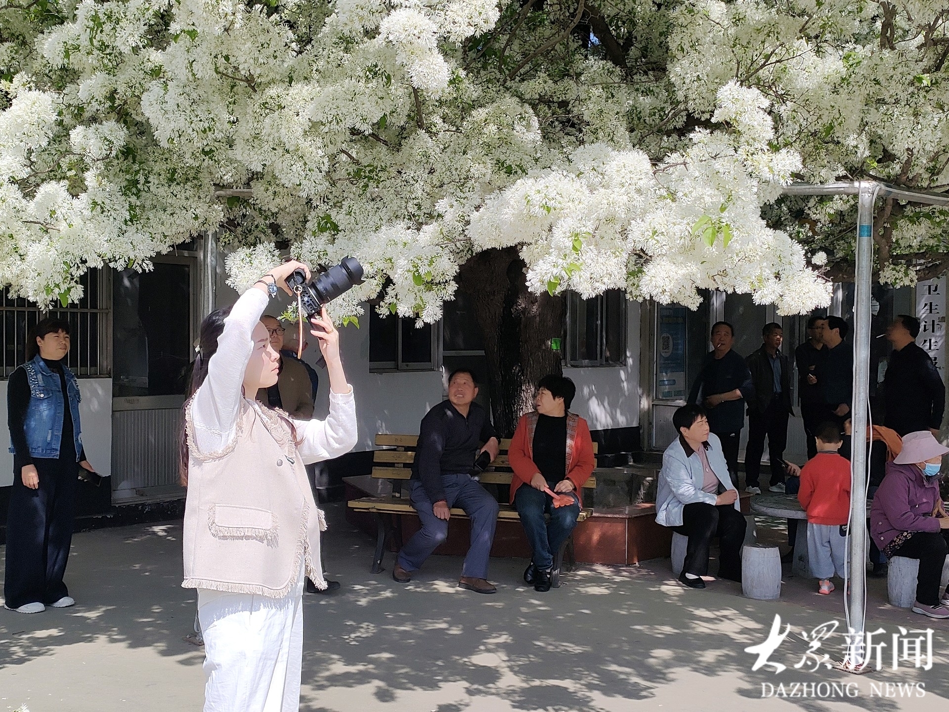 “太出片了!怎么拍都好看。每年4月下旬都在朋友圈见大家‘晒’,一直想亲眼看看,今天终于看到古树‘真容’了。”4月22日,淄博市临淄区敬仲镇辛路村村委大院,专程从城区赶来的市民唐女士举着手机不停取景。周围游客也纷纷用镜头定格这份春日浪漫,或与亲朋好友在树下流连驻足,沉醉在这别致的诗情画意中。