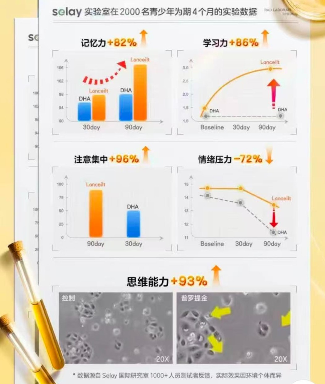 不过,在商品详情页中,品牌仍打出了大量功效,包括“促进大脑发育、改善记忆力、提高学习力、认知力、保护视力”等,并配以具体数据支撑,例如“记忆力提升82%”“学习力提升86%”“注意集中提升96%”“情绪压力降低72%”“思维能力提升93%”,声称这些数据来自“2000名青少年为期4个月的周期服用实验”。
