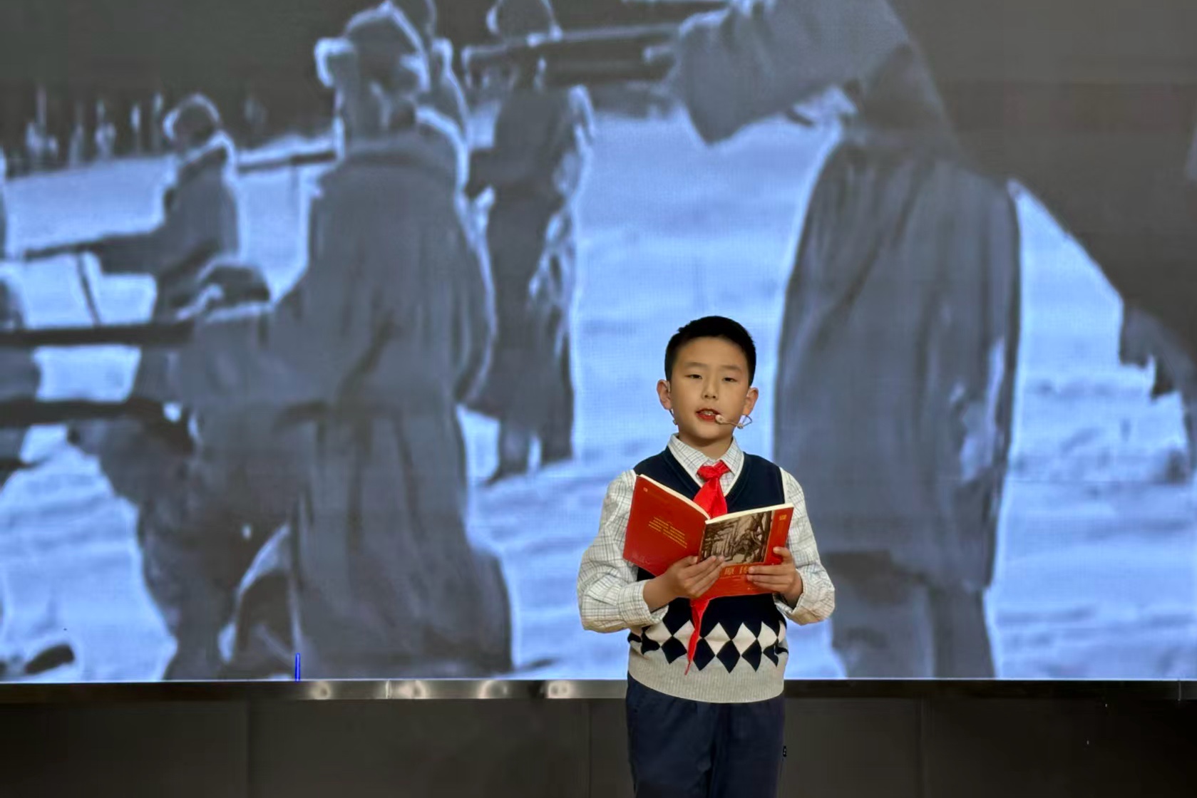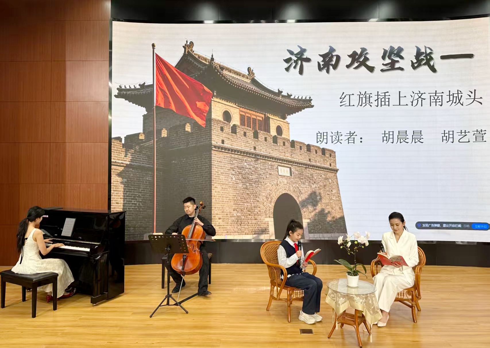 随后,首届 “声动经纶” 红色读书会温情启幕。师生携手家长代表,以诵读为载体、以声音为纽带,回望峥嵘岁月。《飞夺泸定桥》《一战定淮海》《雪原传奇》《红旗插上济南城头》《海防雄兵》《第一枪》等红色经典篇目依次诵读,字字铿锵、直击人心。山东省歌舞剧院演奏家现场倾情伴奏,为整场诵读增添浓厚氛围感。
