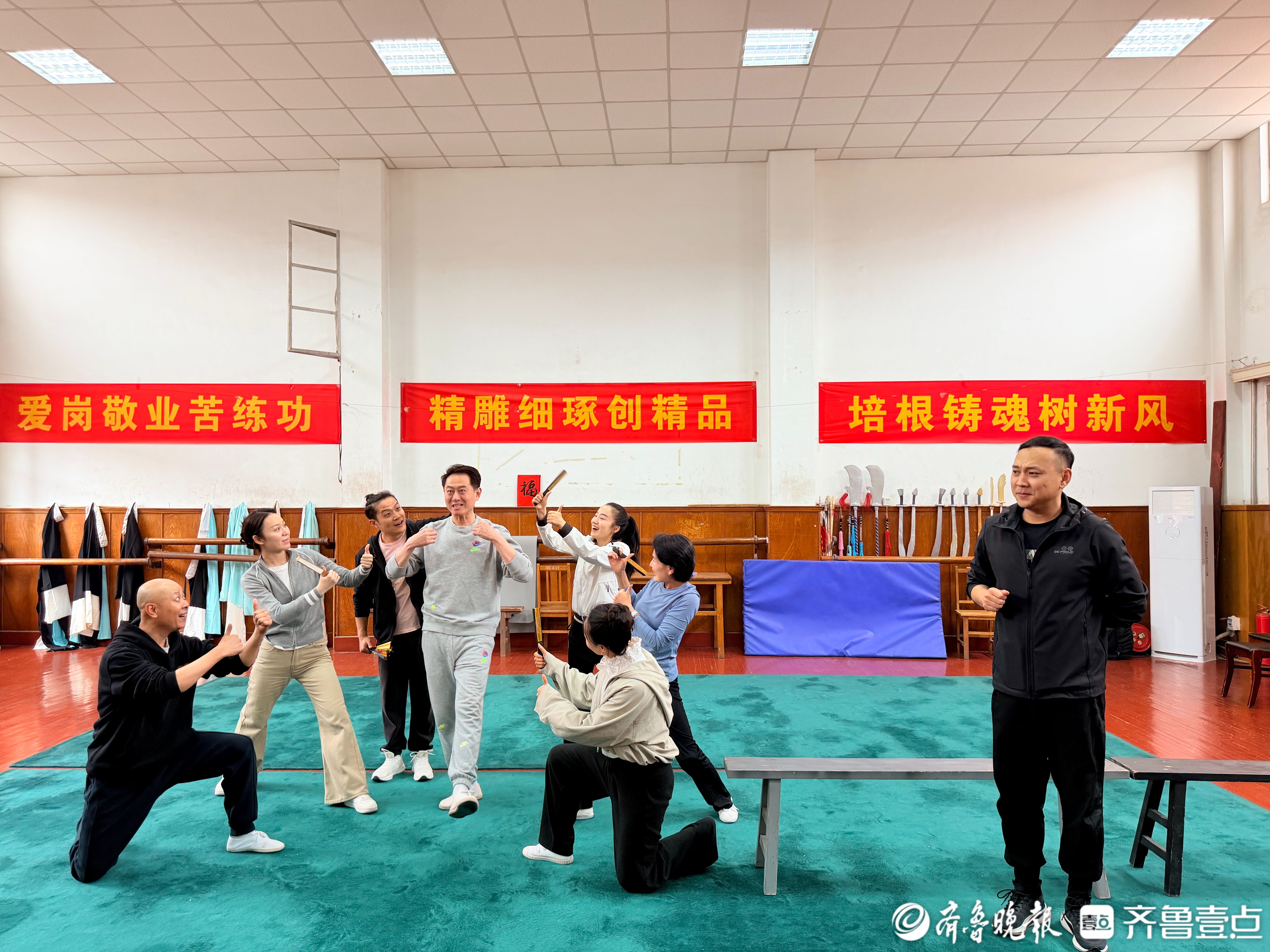 其间,导演宋惠玲不时上场,给演员作演示,抠台词、卡节奏、调走位。“要把清高、嘚瑟体现出来”“抓他那一下卡点”,导演不断提醒演员动作幅度、眼神状态、进场位置,要求身段收放到位、焦点清晰。演员们反复走位、对词、练腔,配合板鼓节奏和曲谱唱腔调整语气与身段,各个桥段一遍遍打磨,确保每一处精准到位贴合人物性格和特定情境。