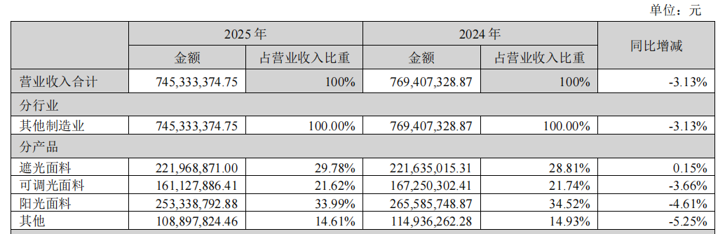 2025年,玉马科技收入结构持续向核心功能性面料集中。其中,公司第一大产品阳光面料实现收入2.53亿元,占营业收入的33.99%;第二大产品遮光面料实现收入2.22亿元,占比29.78%。两大核心产品合计贡献营业收入4.75亿元,占总营收的63.77%,较2024年的63.33%进一步提升0.44个百分点。作为公司重要的高毛利产品,可调光面料2025年实现收入1.61亿元,占营业收入的21.62%,同比下降3.66%。