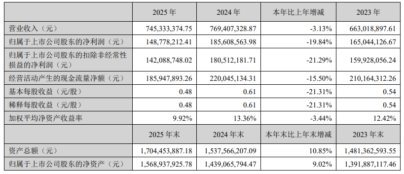 4月21日,玉马科技(300993.SZ)披露了2025年年报。报告显示,公司全年实现营业收入7.45亿元,同比下降3.13%;归母净利润为1.49亿元,同比下降19.84%;扣非归母净利润为1.42亿元,同比下降21.29%。