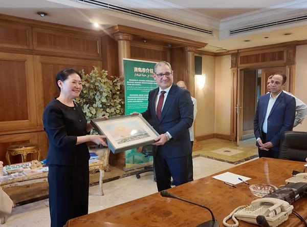 During the visit, the Egyptian side explored a cultural showcase featuring Qingdao's intangible cultural heritage, including paper-cutting, calligraphy fans, and inlaid crafts. Screening of promotional videos, along with AI-produced short films, displayed the charm and technological edge of Chinese cities.