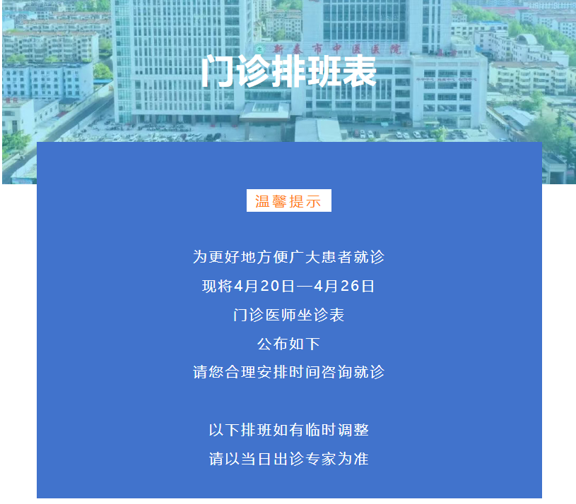 新泰市中医医院4月20日—4月26日门诊排班表来了,快来预约您心仪的专家吧~