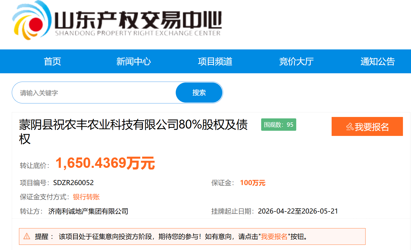 4月22日,蒙阴县祝农丰农业科技有限公司(下称“祝农丰农业”)80%股权及债权在山东产权交易中心挂牌转让,转让底价1650.44万元,转让方为济南利诚地产集团有限公司(下称“济南利诚地产”),挂牌起止日期为4月22日至 5月21日。