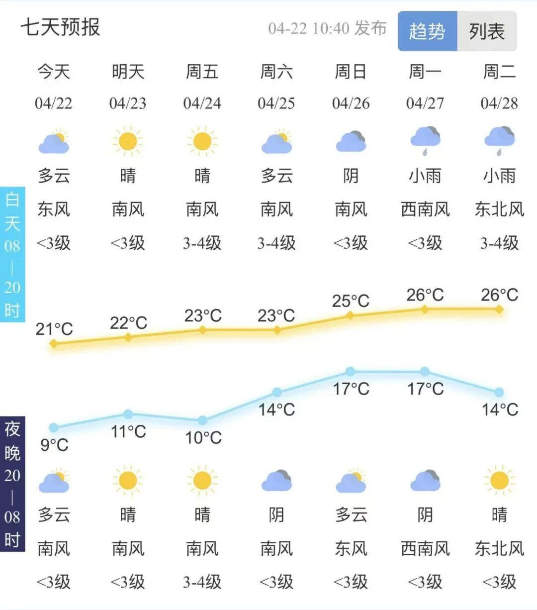 4月23日白天到夜间,晴到少云,南风2到3级,湖面3到4级,最低气温11°C左右,最高气温22°C左右。