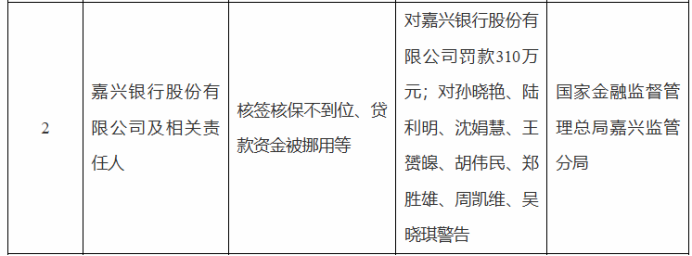 4月21日,国家金融监督管理总局嘉兴监管分局公示的行政处罚信息显示,嘉兴银行因核签核保不到位、贷款资金被挪用等被罚款310万元。同时,8名相关责任人被警告。