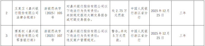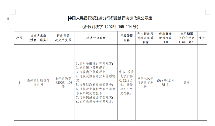 2025年12月26日,中国人民银行浙江省分行发布的行政处罚信息显示,嘉兴银行股份有限公司因8项违法违规被警告、没收违法所得0.4239万元,并罚款247.8万元。其具体违法行为类型为:违反金融统计管理规定,违反账户管理规定,违反商户管理规定,违反反假货币业务管理规定,占压财政存款或者资金,未按规定报送大额交易报告或可疑交易报告,违反网络安全管理规定,违反数据安全管理规定。同时,该行法律合规部王某卫被罚款2.75万元,该行零售银行部傅某权被警告并罚款5万元。