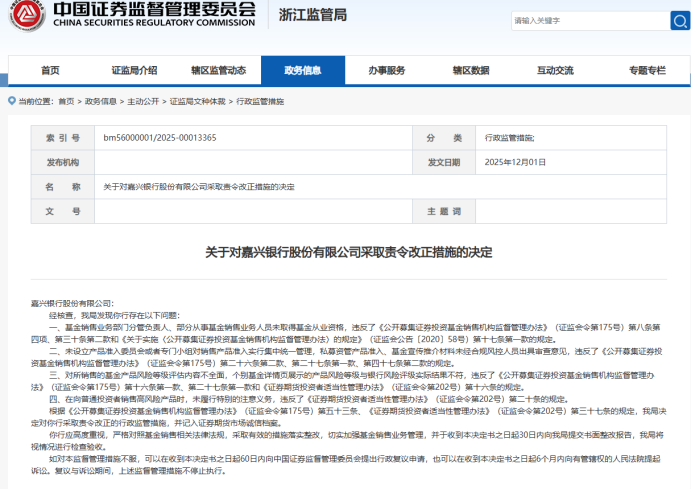 2025年11月,该行还因存在4项违规行为被浙江证监局责令改正。其具体违规行为包括:基金销售业务部门分管负责人、部分从事基金销售业务人员未取得基金从业资格;未设立产品准入委员会或者专门小组对销售产品准入实行集中统一管理,私募资管产品准入、基金宣传推介材料未经合规风控人员出具审查意见;对所销售的基金产品风险等级评估内容不全面,个别基金详情页展示的产品风险等级与银行风险评级实际结果不符;在向普通投资者销售高风险产品时,未履行特别的注意义务。