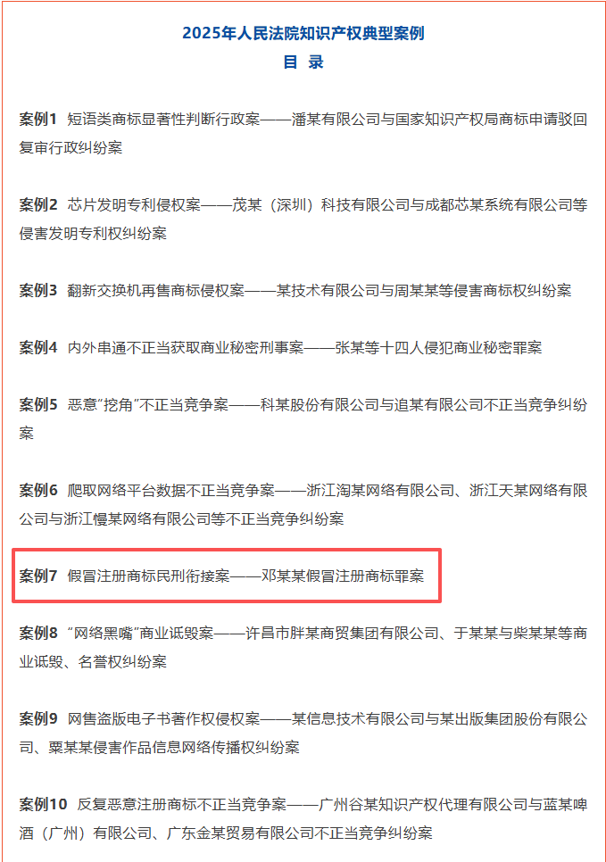 4月20日,最高人民法院2026年知识产权宣传周新闻发布会上,发布了2025年人民法院知识产权典型案例,其中,沂源县人民法院审理的“邓某某假冒注册商标罪案”入选十大典型案例之一。